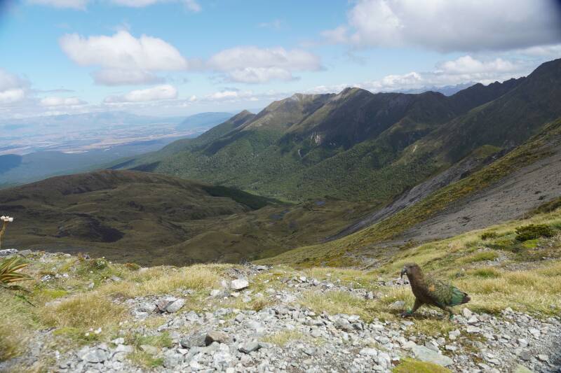 Funny en niet zo funny story. De kea is de enige alpen papegaaiachtige vogel die nog overleeft in Nieuw-Zeeland. Maar wees gewaarschuwd, ze zijn niet mensenschuw omdat ze zeldzaam zijn. Toen wij een ommetje deden naar de top van berg Luxmore hadden we onze rugzakken aan het pad laten staan. Toen ik toekwam op de top was die vogel er en die vloog net weg en ik kon geen foto trekken dus ik dacht jammer. Toen we 15 minuten later terug aan de rugzakken waren weet ik waarom hij wegvloog. De kea vond het nodig om 2 verse bananen te stelen en ook om een gat in mijn zak te pikken om een oude banaanschil te proberen stelen! Blijkbaar zijn het de slimste dieren na apen, heb ik achteraf ontdekt.
