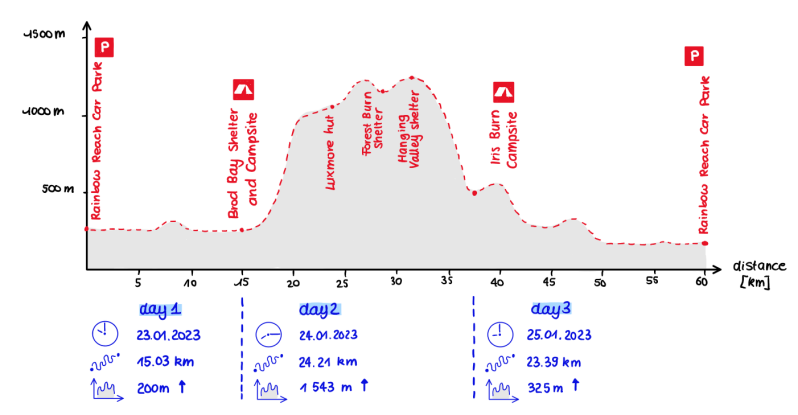 Dit is de kaart van de wandeling, maar ik vind het uiteindelijk hoogteprofiel wel impressionanter. Omdat de huts volgeboekt waren, gingen we voor een 3-daagse tocht met 2 overnachtingen op kampeerplekken. Die zijn vooraf gereserveerd en hebben een capaciteit van ongeveer 20 personen dus zijn niet zo groot. Voorzieningen zijn quasi onbestaande maar je kan water opvullen (je moet het wel nog filteren). Voor de rest gaat alles in de gigantische rugzak die je de hele tijd meedraagt. Die rugzak die in het begin niet zo zwaar lijkt maar al gauw voelt alsof het een zak stenen is.